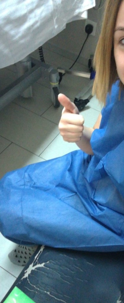 Al día siguiente (3er día de ingreso), vinieron a quitarme la sonda. Tras eso vendrían a incorporarme y ya podía moverme. ¡¡Que alegríaaa!! Pues mi gozo en un pozo….. me quitaron la sonda, apenas me enteré de ello… después me indicaron que iban a incorporarme y dejarme sentada en la cama 10 minutos, si lo toleraba me levantarían. Me incorporan en la cama… super felizzz, me hago una foto y se la mando a mi amigo, empiezo a notarme algo mareada, escucho todo como lejos y grito: mamá me desmayo!!!! me tiré corriendo hacia atrás en la cama!