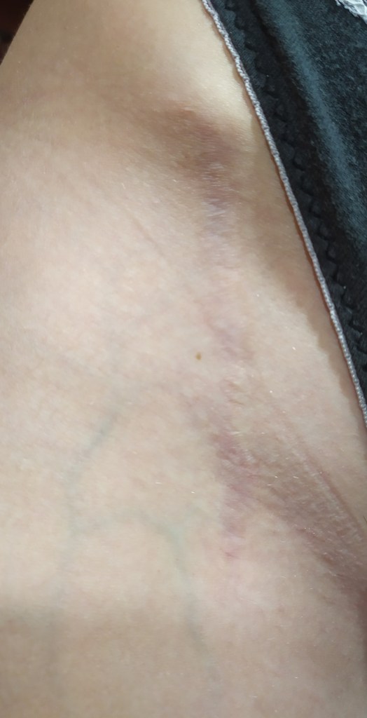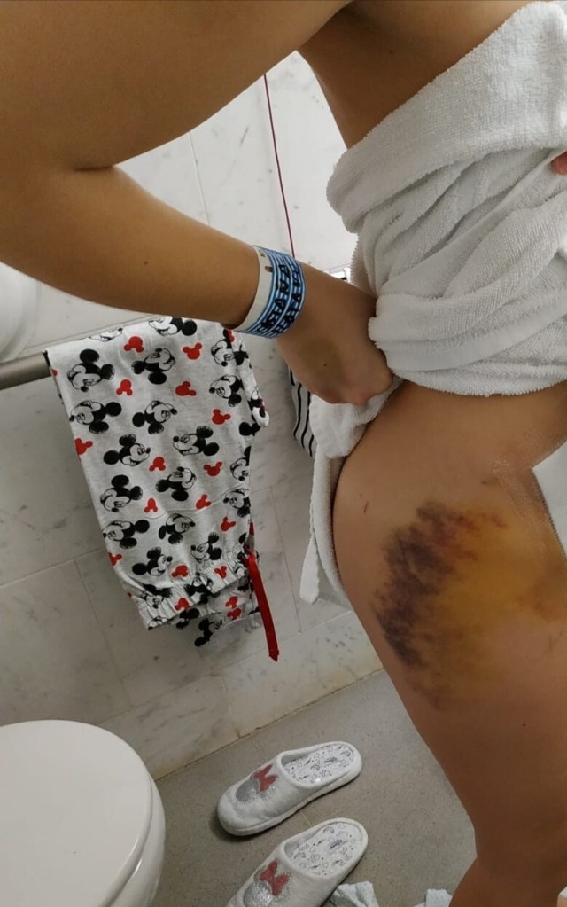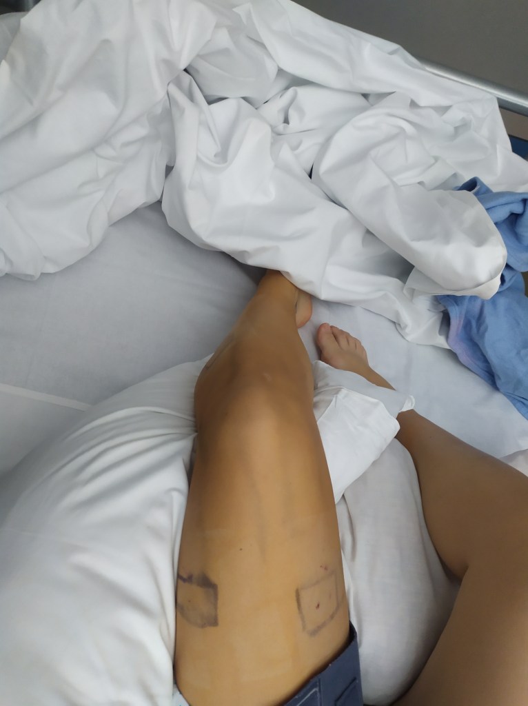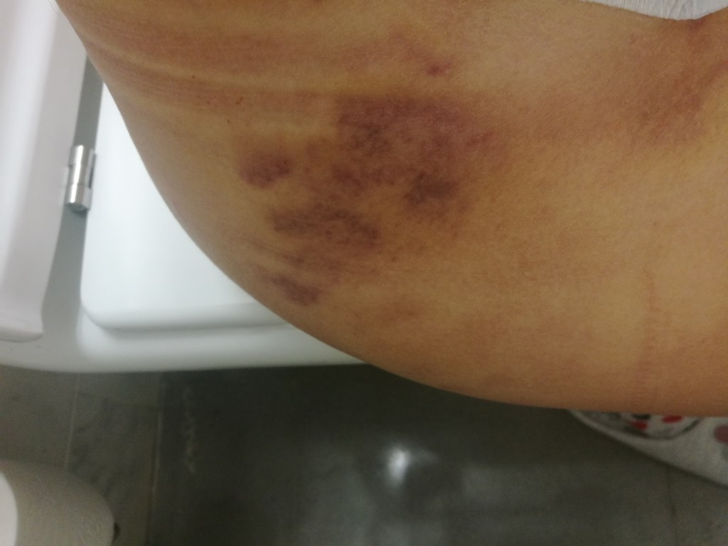 Aquí tengo que hablaros del tema dolores. Duele, como he mencionado en ocasiones, no hay nada insoportable, cada 4 horas te ponen medicación y se puede llevar, pero si es cierto que son dolores o sensaciones un poco desagradables. Tienes hematomas por muchas zonas del cuerpo, en mi caso la entrepierna una de ellas, por lo que cuando iba al baño a hacer pis, era un poco doloroso, tenia esa zona negra. Os voy a poner algunas imágenes de esto porque tampoco te avisan y no te esperas verte así.