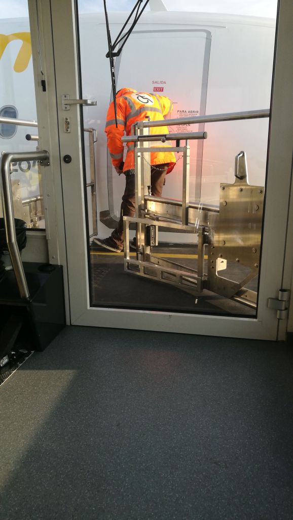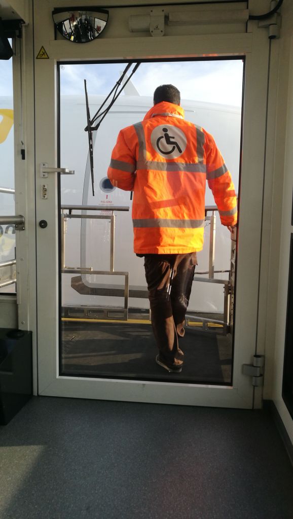 Al final unos familiares pudieron venir a por mi al Hospital y llevarme al Aeropuerto. E el aeropuerto, dos días antes del vuelo debes solicitar asistencia. Esto significa que a la hora de facturar, hay unos asientos (en cada aeropuerto será de una manera diferente) donde hay un cartel de minusválido. Yo me esperé ahí hasta que viene el personal de asistencia con una silla de ruedas a por ti. Te llevan hasta la zona de control, es una zona de control especial, donde como en todas, tienes que pasar por el arco y dejar tus cosas en la cinta. Aquí quiero hacer otra puntualización, yo podía levantarme y pasar por el arco andando con las muletas, me dijeron que si podía y les dije que no, no tienes porque levantarte y pasar dolor cuando vas en esa situación. Me pasaron el detector de metales, una señora me cacheó un poco y listo. Aquí vienen en un coche a recogerte, a ti y a tus acompañantes, te llevan a una zona donde está toda la gente que precisa asistencia y allí se quedan con tu billete controlando tu vuelo ya que tu pasas con prioridad, si tienes que ir al baño incluso te llevan. Aquí hay como otros niveles de incapacidad, obviamente yo no podía subir todas esas escaleras con facilidad, yo les expliqué que quizá pudiera pero que no lo sabía a lo que respondieron que les daba igual ellos tenían como subirme y así lo harían.