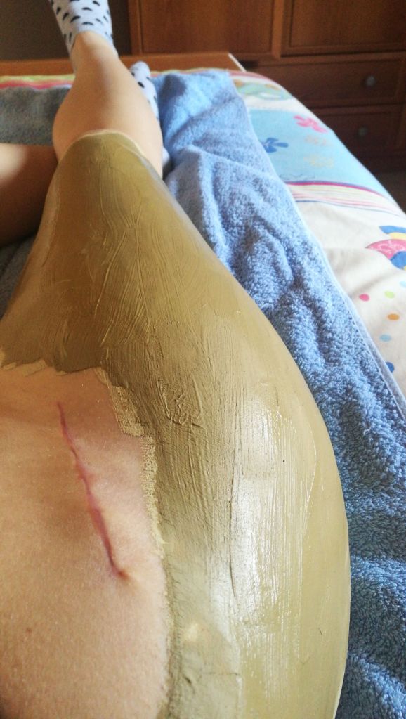 Además de ponerme frío en la pierna, me ponía arcilla en ella. Podéis ver sus propiedades si lo buscáis, habrá quien crea en ella y quien no, pero daño, no le hace a nadie. Con un pincel con el que te pones las mascarillas de la cara, me pintaban la pierna, esperaba a que se secara y a la ducha.
