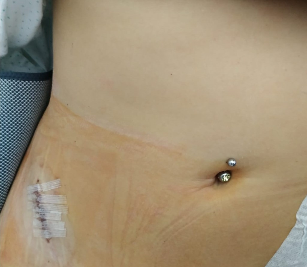 Antes de continuar se me ha olvidado contar el episodio tras la sonda. Yo vi mi operación antes de hacérmela, vi fotos, me empapé, pero una nunca está preparada para ver sus heridas de guerra. La misma auxiliar que iba a ayudarme en la ducha, tenía que cambiarme el apósito y ponerme el de ducha (es uno que se puede mojar y aísla la herida). Fué a quitarlo y me dió un pequeño «ataque de pánico». No quería verme la herida, al ser yo tan pequeña y saber el mini mundo que tenía liado en mi cadera me esperaba una bestialidad. Hice a mi madre mirar antes de mirar yo, ella empezó a reírse diciendo que tenía rajas mas grandes!!
