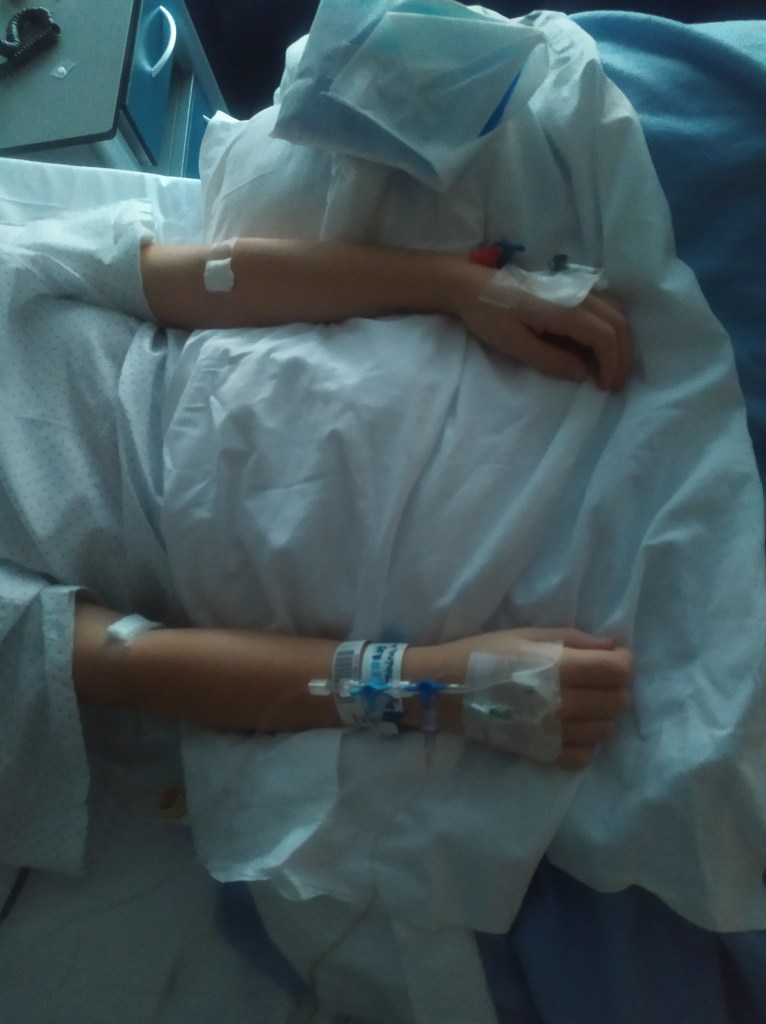 La verdad, no tardaron mucho en venir a por mí. Me despedí de mamá y me subí en la camilla, a lo que el celador al verme los calcetines me dijo: «Los calcetines fuera señorita!» Puse cara de puchero y le dije que era muy friolera, a lo que me respondió que me iba a poner muchas mantas, que no me preocupara entre risas.