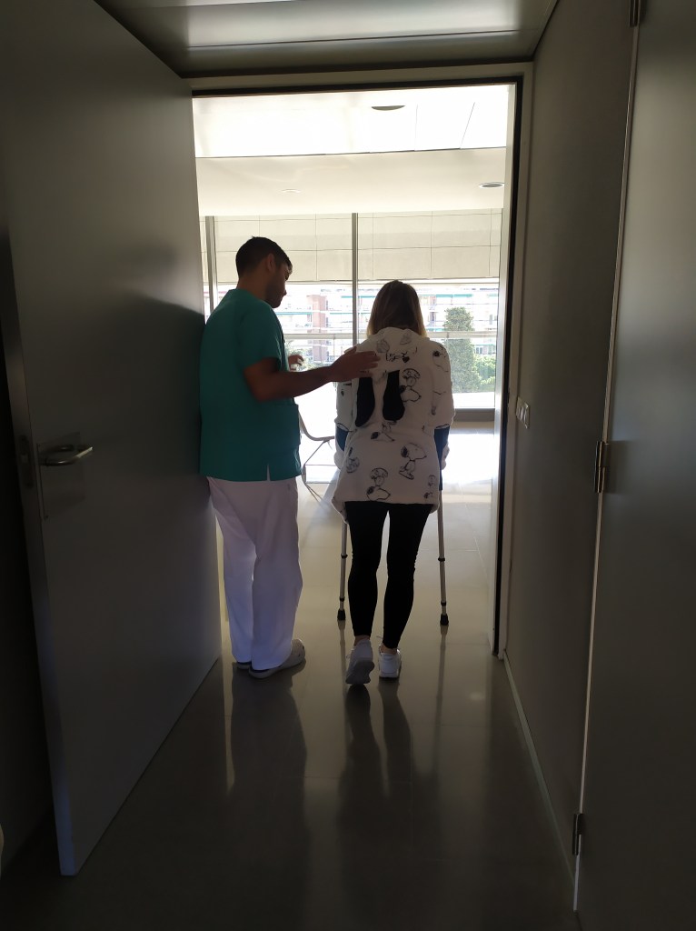 Me enseñó como tenía que andar y me llevó por el pasillo con ella, yo le decía que no podía ponerme recta y ella me decía que era normal. Hicimos el pasillo un par de veces y me enseñó a levantarme y tumbarme sola en la cama, que la verdad es un poco doloroso. Por este día estaba bien.. parecía que había corrido una maratón.